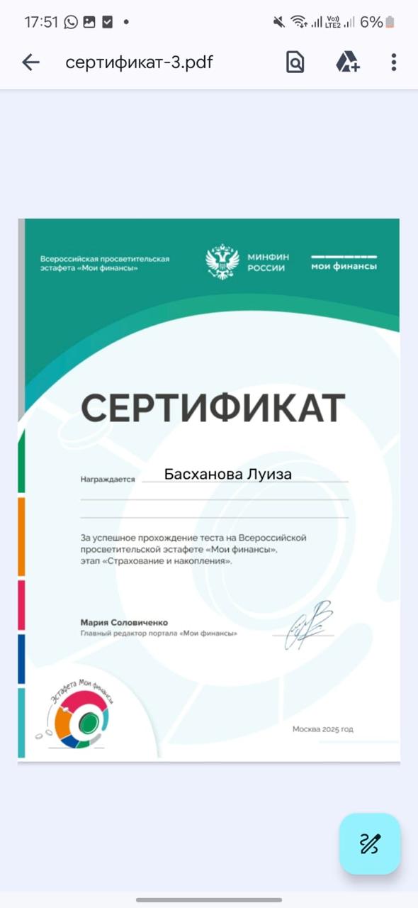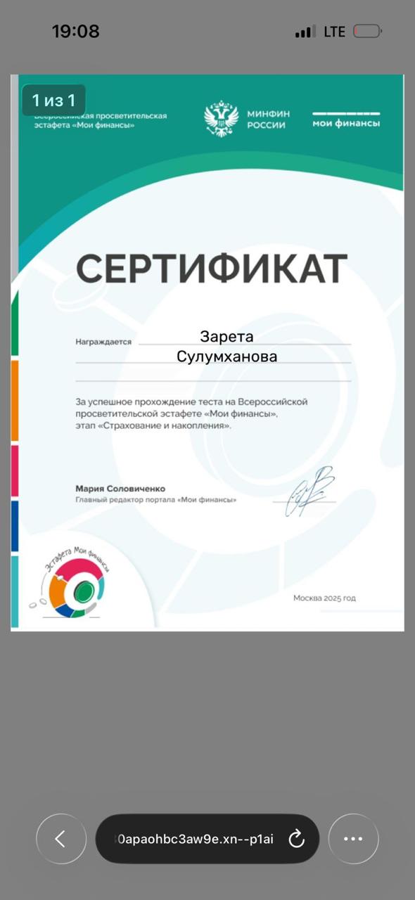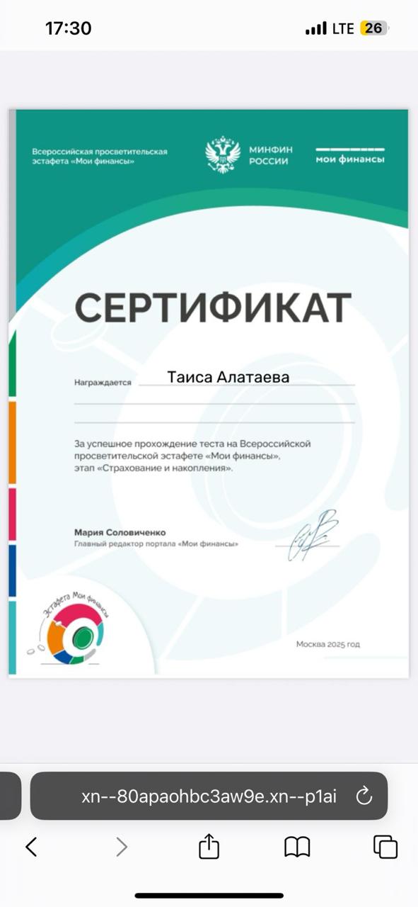 17.11.2025В МБОУ « Калиновская НОШ» 10 ноября 2025 г прошла тематическая «Всероссийская просветительская эстафета «Мои финансы». Которая посвящена теме: «Семейный бюджет: как не ссорится из-за денег?».Провели тест к шестому этапу: Думай о будущем: страхование и накопленияПолучили сертификат.
