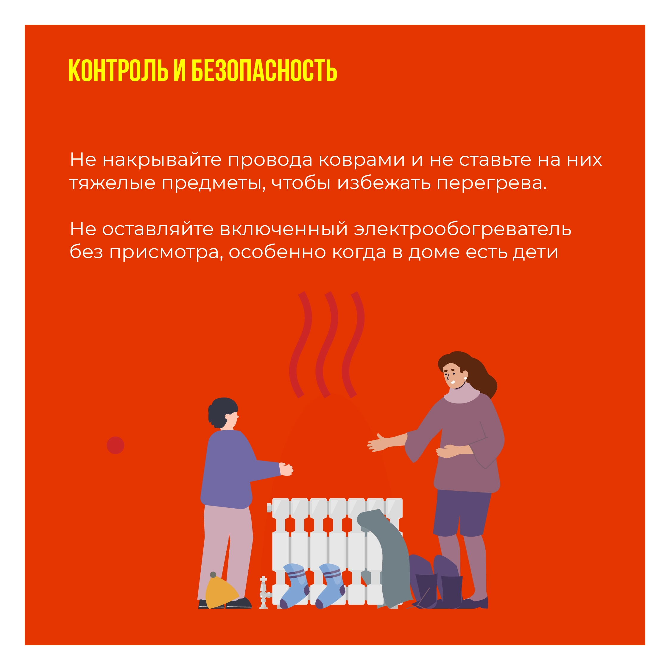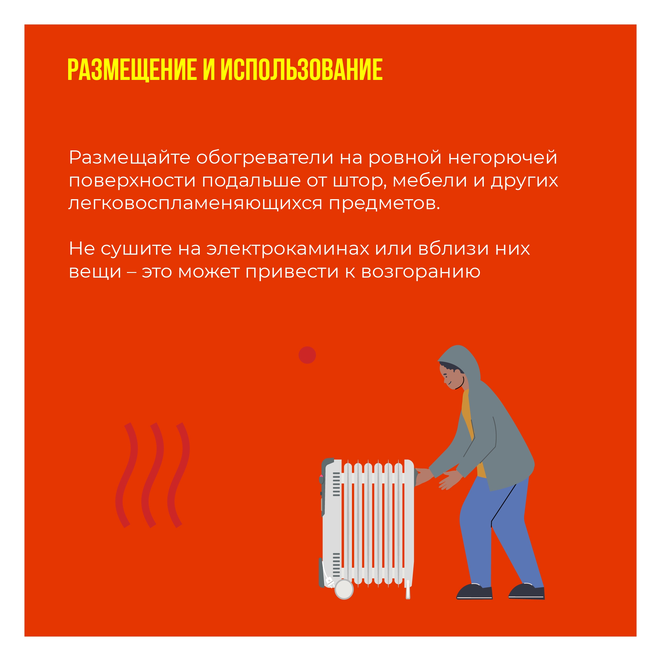Часто источником становятся не только газовые приборы, но и электрообогреватели, а также перегрузки электросети. В карточках собрали для вас рекомендации по безопасной эксплуатации электрообогревателей.