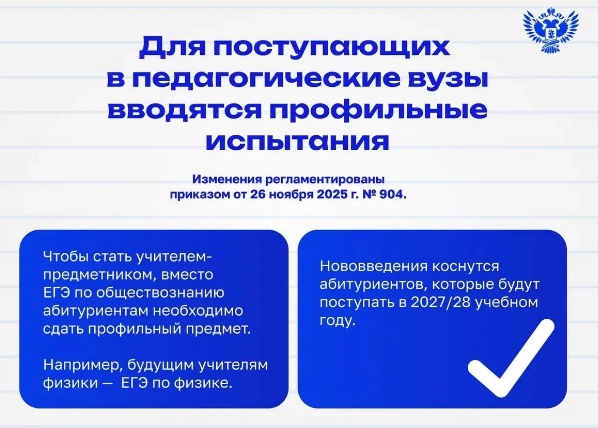 Согласно ему при поступлении в 2027/28 учебном году на педагогические направления по профилям «Математика», «Физика/Астрономия», «Информатика», «Химия», «Биология», «Русский язык», «Литература» больше не будет приниматься ЕГЭ по обществознанию в качестве обязательного вступительного испытания. Вместо него абитуриентам необходимо сдать профильный предмет. Мнение эксперта: В соответствии с приказом Минобрнауки Российской Федерации и Минпросвещения РФ от 26 ноября 2025 года № 904 внесены изменения в перечень обязательных предметов для поступления в высшие учебные заведения. В связи с этим Министерством образования и науки ЧР в десятых классах уже начата работа по разъяснению учащимся данных изменений, чтобы сориентировать их на целенаправленную подготовку к необходимым экзаменам. Это означает, что обучающимся, которые в настоящее время учатся в 10-х классах, необходимо заранее скорректировать свои образовательные планы и определиться с предметами по выбору в зависимости от выбранной специальности и направления дальнейшего обучения —, сказала директор Департамента общего образования Хасуева Зулай Шариповна. #Официально